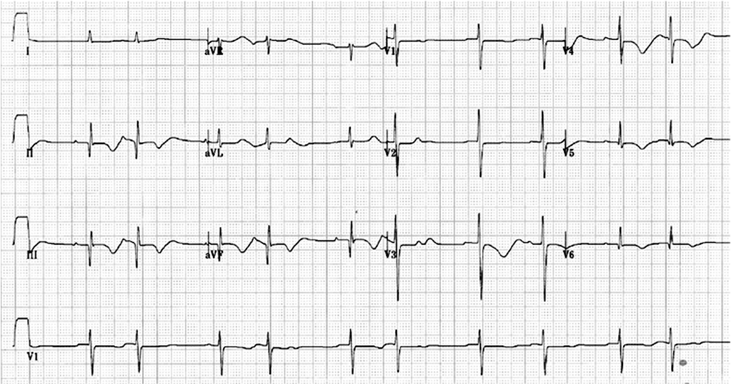 T wave inversion (II, III, aVF, and V4-6 lead) , and first degree atrioventricular block