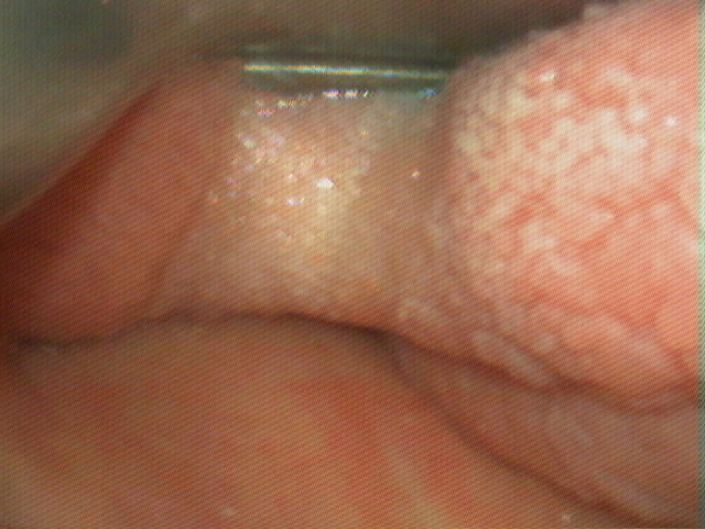 The midwifery team continue CTG monitoring as you prepare on the table. At the last moment the abdomen is prepared with sterile disinfectant and draped. You induce the patient with anaesthesia as you described and proceed to intubate the patient. This is the view you achieve (click here for image). Comment on this laryngoscopy.