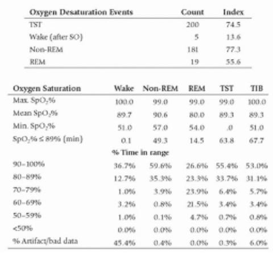 There were 200 desaturation events with mean desat down to 89% but the lowest during both REM and non-REM sleep was in the 50s. This gave an ODI of 74 which correlates well with the AHI result.