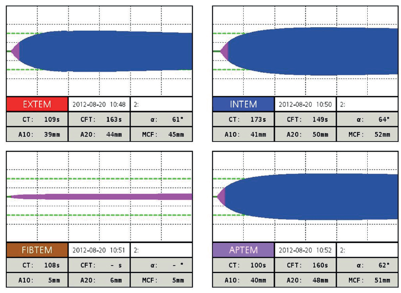 12. The ROTEM taken 20 minutes ago have some results available. (There was a computer glitch and a sample had to be re-run). Interpret and describe any follow-up action.